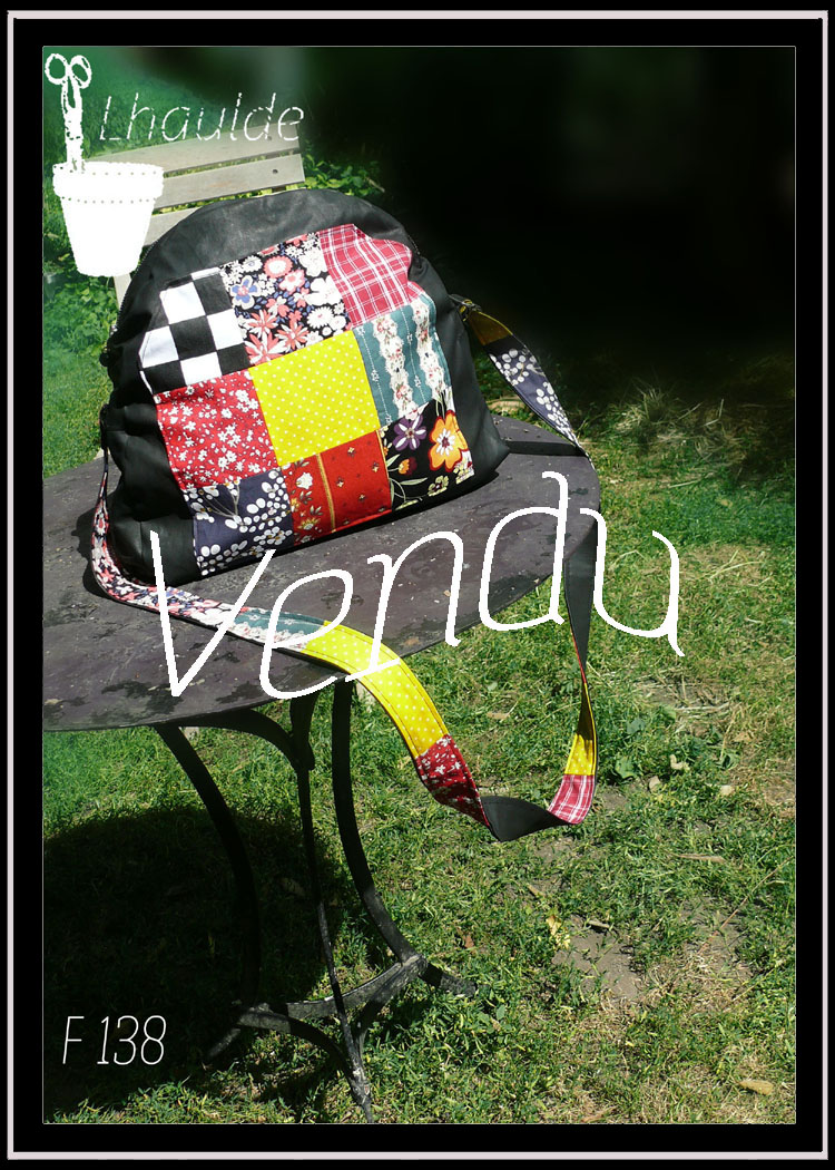 sac en simili cuir arrondi sur le dessus et garni de carrés de tissus variés, mention vendu