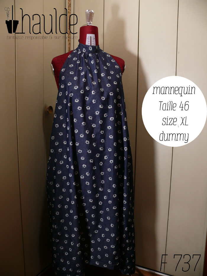 Robe longue dos nu, nouée autour du cou, deux poches taille 44 à 48, compatible avec un 42 si vous faites 95 cm de tour de poitrine minimum