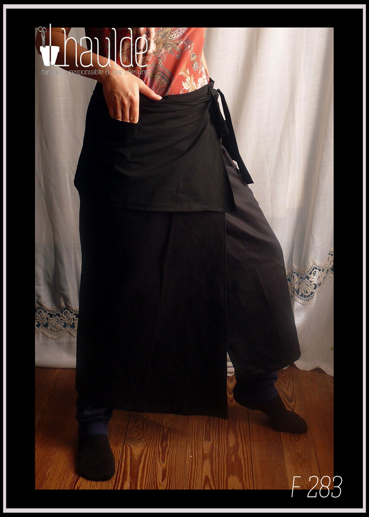 Jupe portefeuille longue sur mesure, avec mini tablier en haut et poche secrète, coton noir oeko tex