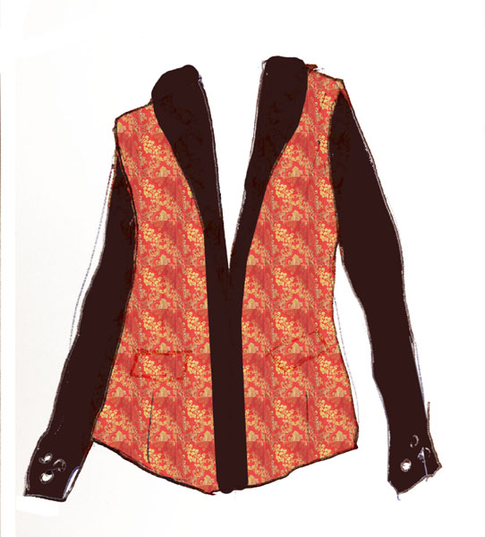 Veste sur mesure, sergé noir (coton oeko tex) et jacquard rouge (polyester)